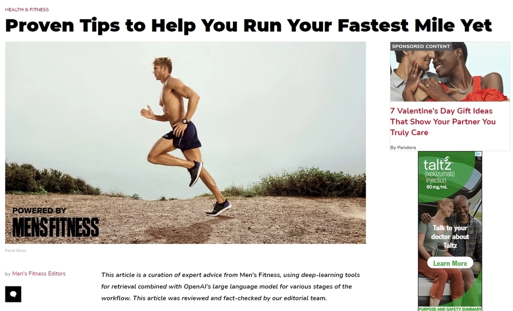 출판사의 인간 편집자들은 AI가 작성한 기사에 대해 사실관계 등을 확인한 뒤 잡지에 게재했다. 작성자가 `맨스 피트니스 편집자`로 표기된 이 기사 앞부분에는 AI 기술이 활용됐다는 사실이 적시됐다.