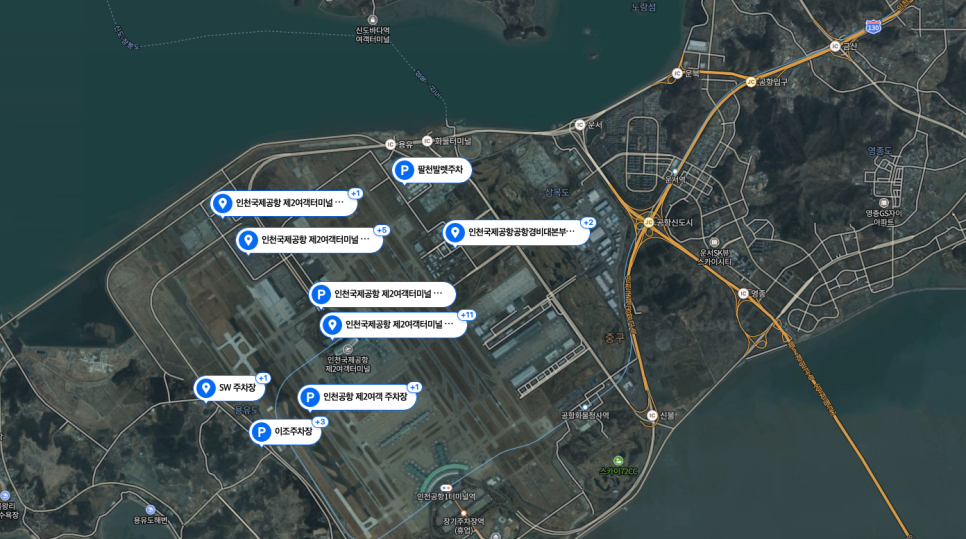 위 사진은 그 중에서도 오늘 글의 주인공인 인천공항 제2여객터미널의 주차장 위치입니다. 차량을 이용하실 분들이라면 지도 보시는 것이 어렵지 않으실텐데, 지도를 보시면 공항신도시JC를 기점으로 운서IC 방향으로 이동하셔서 화물터미널을 지나 인천공항 제2여객터미널 입구로 진입하게 되실겁니다.