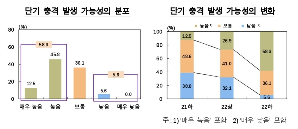 한국은행이 27일 공개한 `시스템 리스크(위험) 서베이(설문조사)` 결과에 따르면, 국내외 금융기관 임직원과 주요 경제 전문가 72명에게 금융시스템 위기를 초래할 충격이 단기(1년 이내)에 발생할 가능성을 묻자 58.3%가 "높다"(매우 높음 12.5%+높음 45.8%)고 답했다.