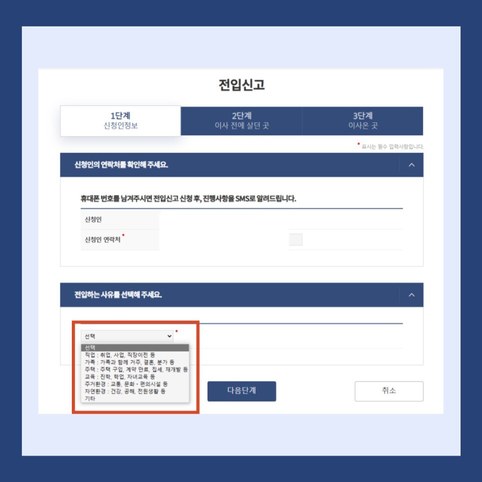 본인에게 해당되는 전입하는 사유를 선택해주시면 됩니다.