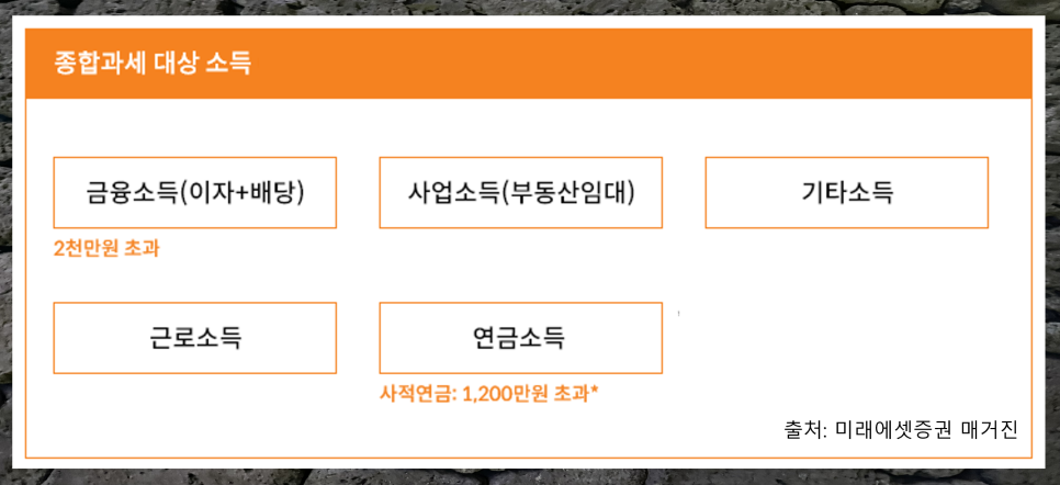 근로소득 뿐만 아니라 이자소득, 배당소득, 사업소득(부동산 임대), 연금소득, 기타소득을 포함한 모든 종합 소득에 대해 납부하는 세금입니다.