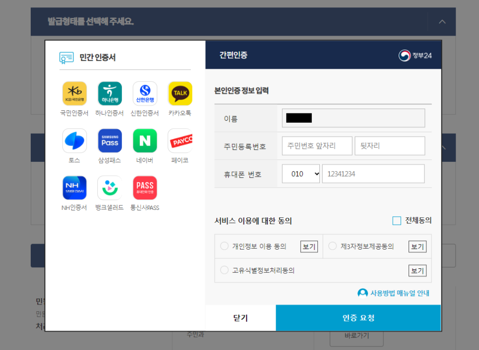 이때는 카카오톡, 토스, 네이버 등으로 인증을 해야 합니다.