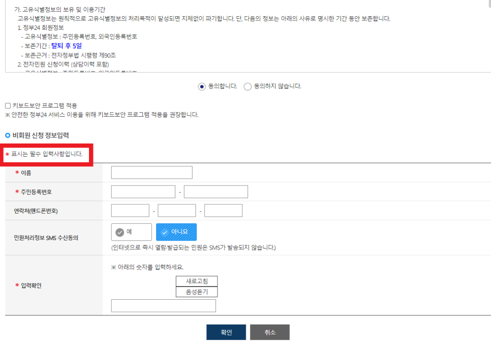 다음으로는 동의서에 동의를 해주시고, 비회원 신청 정보를 입력해주셔야 합니다.