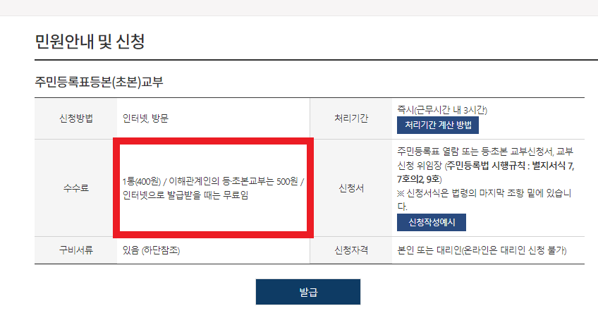 1통에 400원이며, 이해관계인의 등본, 초본 교부는 500원이라고 합니다.