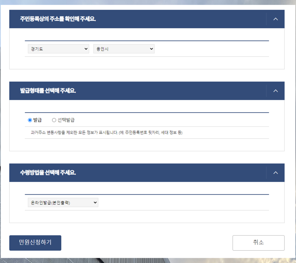 과거 주소변동사항이 들어가면 문서가 길어지기 때문에 제출목적에 따라 필요하지 않다면 제외해 발급해주셔도 좋을 것 같습니다.