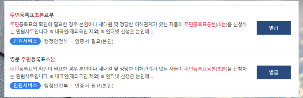 주민등록초본 발급을 서비스명에 검색하면 ‘주민등록표초본 교부’와 ‘영문 주민등록표초본’이 나옵니다. 위가 국문버전이고 아래가 영문 버전입니다.