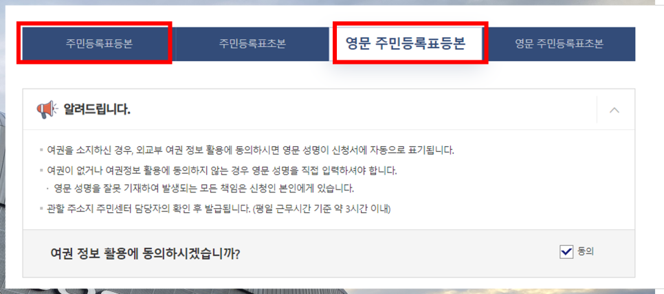 국문 주민등록등본과 영문의 차이점은 영문 주민등록등본은 즉시 발급되지 않는다는 점입니다.
