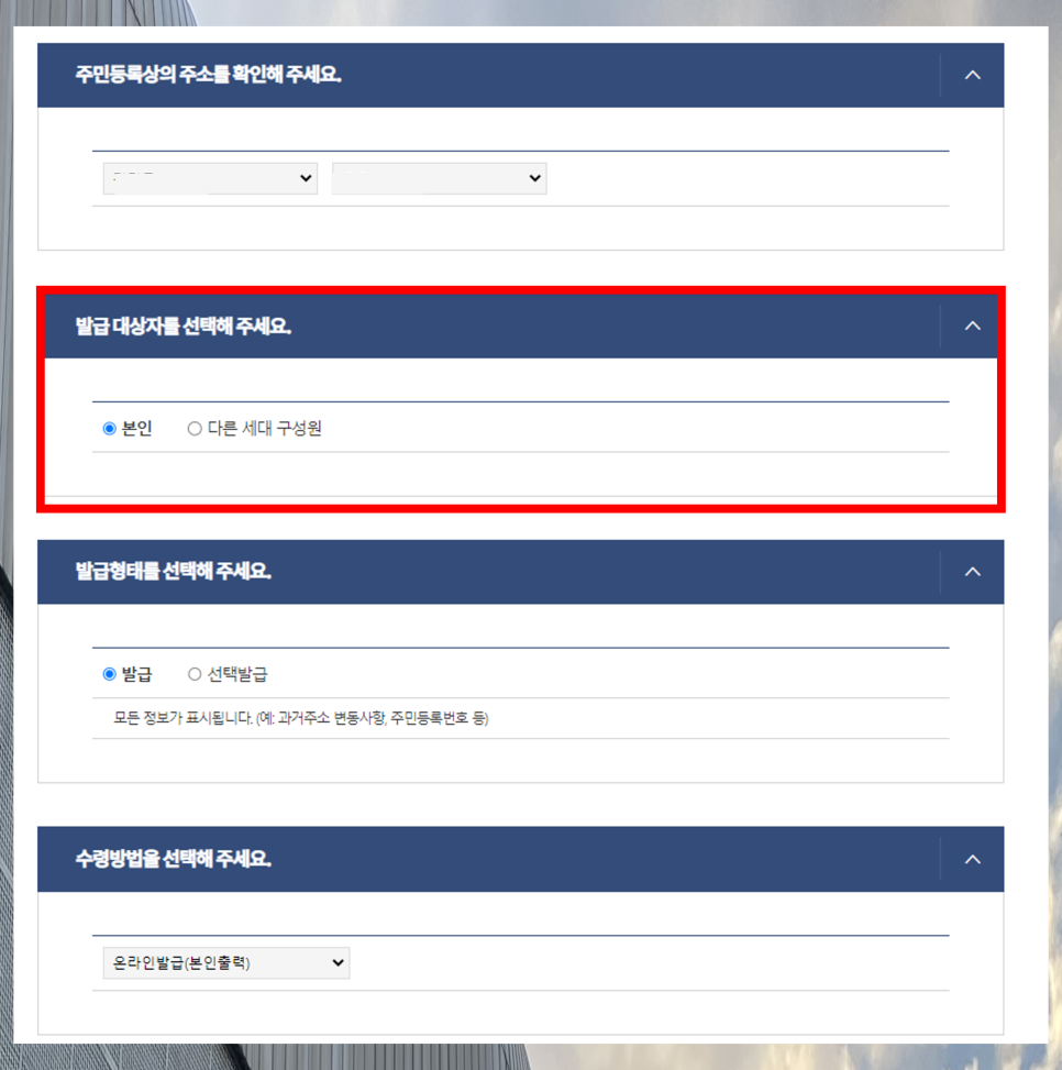 주민등록상의 주소를 확인하고 수령방법은 온라인 발급을 눌러주세요.