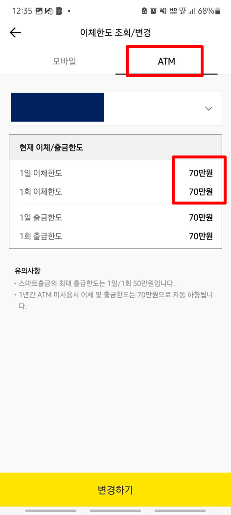 또한 ATM기에서 이체할 수 있는 한도를 확인, 변경할 수 있는데요.