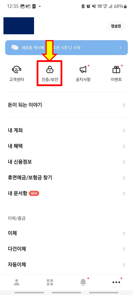 보이는 상단 메뉴 중 [인증/보안]을 클릭합니다.