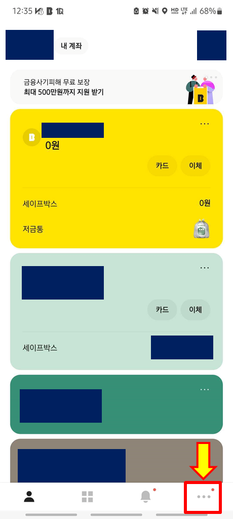 로그인 후 처음으로 보이는 화면 오른쪽 하단에 점 세개 더보기 아이콘을 클릭합니다.