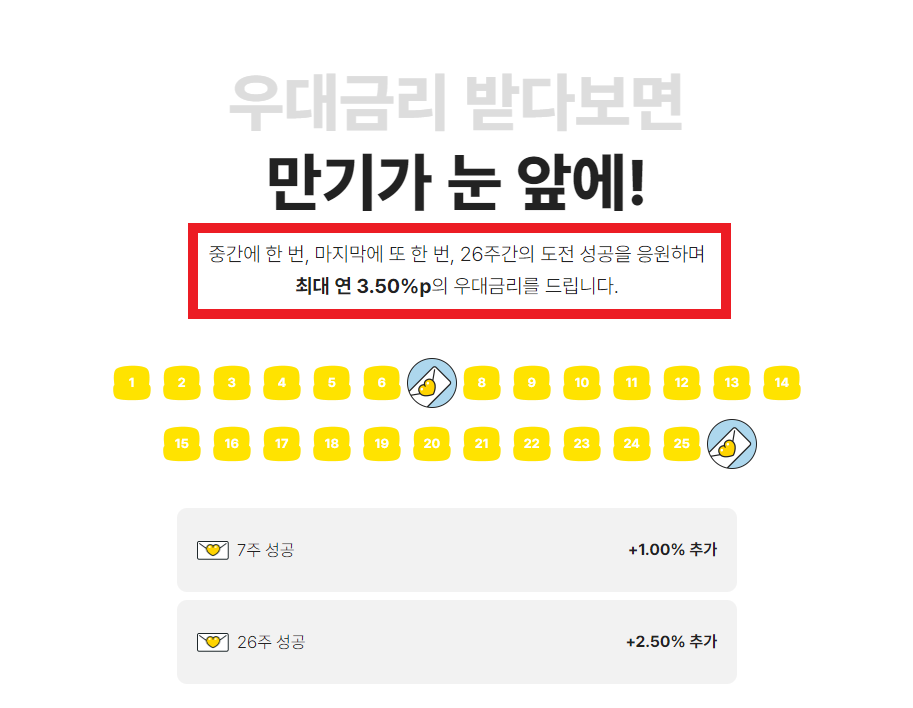 두 번째로는 26주 연속으로 적금에 성공하는 것인데요, 이때 2.5%의 이자가 추가되어 최고 7%의 금리를 적용받게 됩니다.
