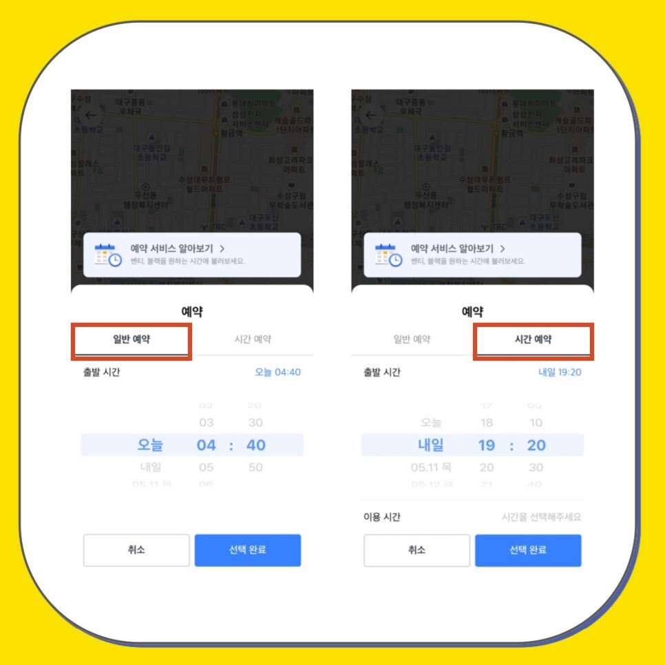 일반 예약과 시간 예약을 선택할 수 있습니다.