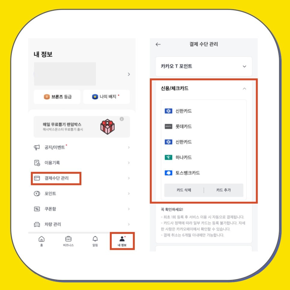 어플 우측 하단 내정보 탭에서 "결제수단 관리" 메뉴로 진입하면