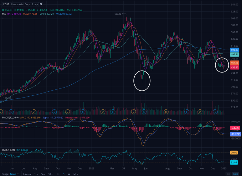12월 15일 연준이 금리를 다시 인상하고 2023년에 추가로 75bp의 금리 인상을 예상한 후 경기 침체가 다가오고 있다는 우려를 더하면서 시장 전체의 매도세에 코스트코 주가는 4% 또 큰 하락를 하였습니다.