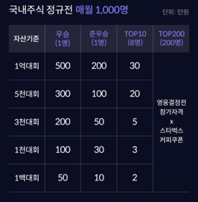 키움증권답게 상금 규모가 꽤나 쎈 편인데... 국내리그 해외리그 각각 1억리그 1위는 500만원, 2위는 200만원, TOP10에 들어갈 경우 30만원의 상금을 준다고 하네요.
