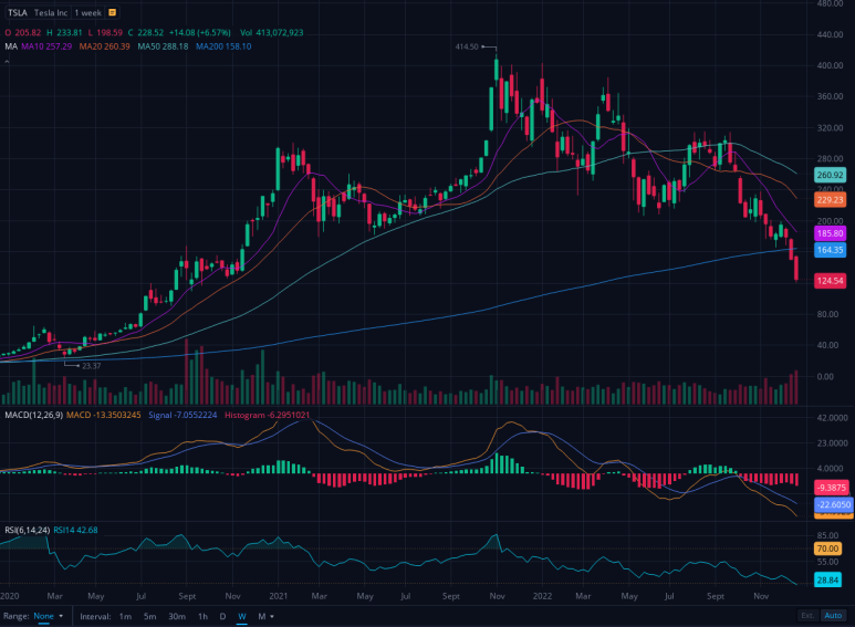 목요일 테슬라 주가는 8.88%나 떨어졌으며, 현재 포스팅 쓰는 기준으로도 2020년 9월 이후 최저가를 기록했습니다.