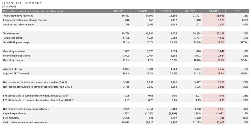실제 테슬라의 1분기 매출은 233억달러로 1년 전보다 24% 급증은 하였지만 그 반면에 순이익은 25억1000만달러로 24% 감소 전환하였습니다. 이는 차량 가격의 인하가 큰 요인 중 하나라고 할 수 있으며 총 마진을 지난 분기 23.8%에서 19.3%로 낮춰 추정치인 21.1%를 크게 밑도는 수치였습니다.
