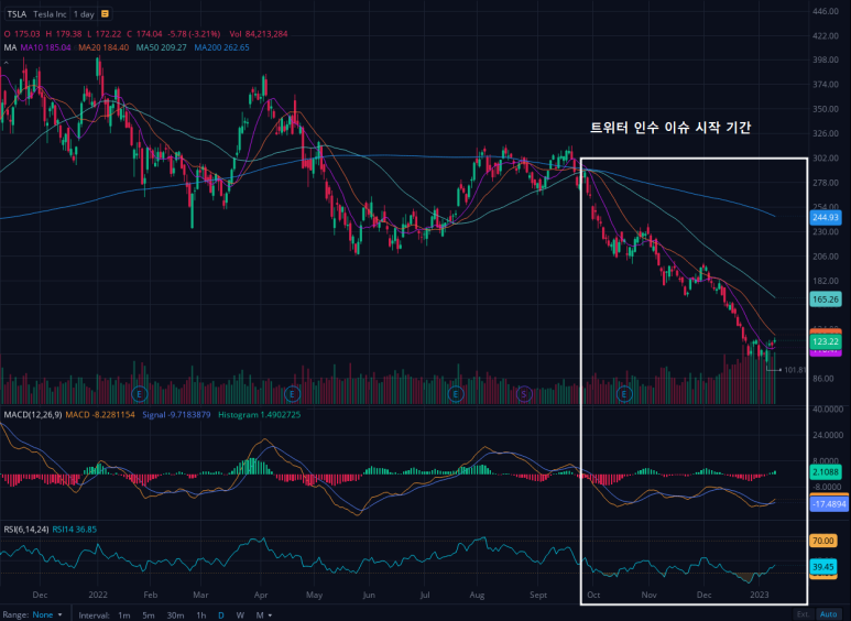 10월 말 이후 테슬라의 주가가 하락한 것은 우연일까요? 저는 그렇게 생각 안합니다. 딱 이때가 일론머스크가 트위터 인수 이슈 및 CEO로 임명된 시점입니다.