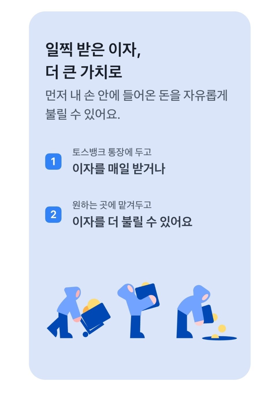 토스는 이자 혜택을 바로 체감할 수 있다, 이자를 먼저 받아 재투자하라며 홍보했지만 소비자에게는 전혀 반대로 먹혔습니다.