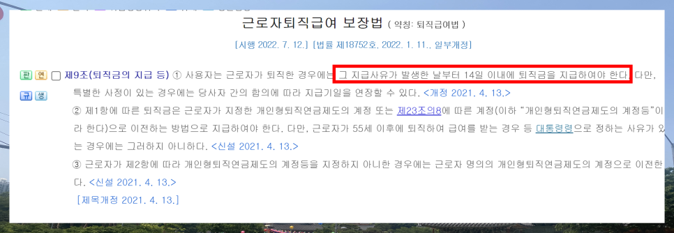 물론 근로 당사자와 협의하면 14일 이후라고 퇴직금 지급 기한을 연장할수도 있죠.