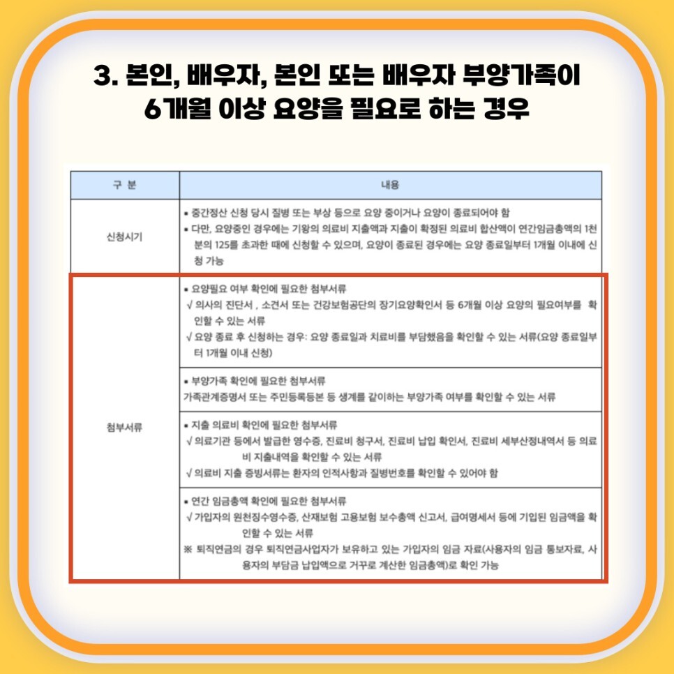 3. 본인, 배우자, 본인 또는 배우자 부양가족이 6개월 이상 요양을 필요로 하는 경우.