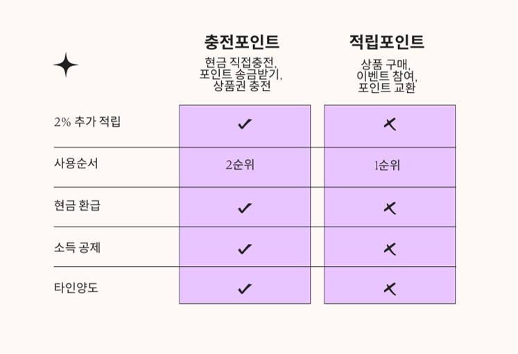 포인트 충전 시 ‘충전 포인트’로 적립되고 그 외의 방법으로 충전된 포인트(프로모션, 다른 포인트를 전환)는 ‘적립 포인트’로 적립됩니다. 충전포인트와 적립 포인트 차이점은 위 도표를 참고해주세요! 현금 등으로 충전하는 충전포인트만 현금 환급, 소득공제, 타인 양도가 가능합니다.