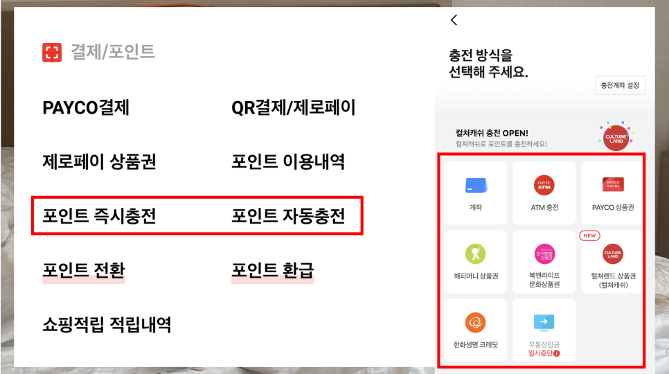 [페이코 앱] – [더보기] – [결제/포인트] – [포인트 즉시 충전] 으로 들어가면 됩니다. 적립 포인트 충전은 계좌에서 현금으로 충전하거나, 해피머니 상품권, 북앤라이프 문화상품권, 컬처랜드 상품권(컬쳐캐쉬), 한화생명 크레딧을 포인트로 전환할 수 있습니다. 포인트를 자주 쓰는 분이라면 일정 금액 포인트가 늘 잔액이 유지하도록 ‘자동충전’ 설정도 할 수 있어요!