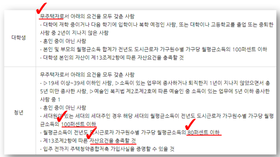 가장 중요한 것은 무주택 / 소득기준 / 자산 기준입니다.