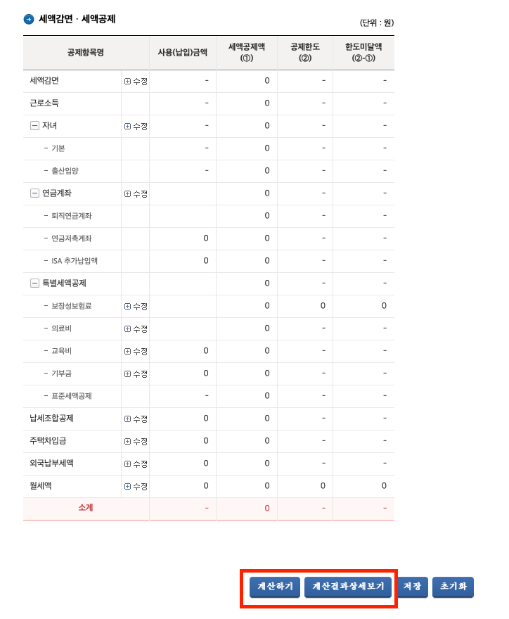 상단에서 설정할 것들을 다 확인한 후 스크롤을 내려 위와 같은 화면을 지나 화면 하단의 [계산하기] 혹은 [계산결과 상세보기] 버튼을 눌러보시면 국세청에 제출된 서류와 공제 내용 등을 반영한 연말정산 예상 환급금을 대략적으로 계산해볼 수 있습니다.