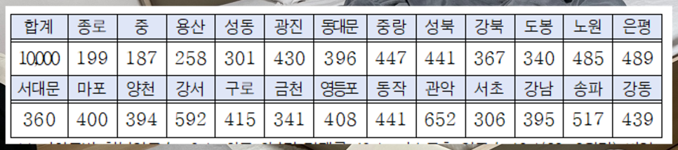 총 1만명을 모집하고 형평성을 위해 자치구별 청년 인구수에 비례해 구별 모집인원이 정해져 있습니다.