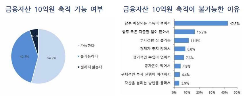 금융자산의 종잣돈으로 여겨지는 1억 원을 마련해 대중부유층에 진입하는데 기여한 소득원은 77.6%가 근로·사업소득이었다. 현재 수준의 자산을 축적하는 데도 54.8%는 근로·사업소득이 가장 기여했다고 생각했다. 부동산 투자로 답한 비중은 22.6%로, 시드머니 마련 이후 자산축적 과정에서 부동산 기여도가 높아졌다.