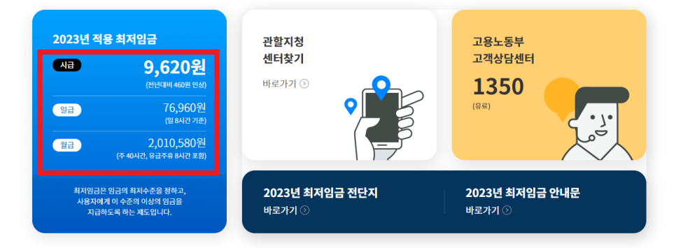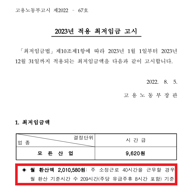 작년 8월에 고용 노동부에서 고시한 2023년 최저임금 적용 월급을 보도록 하겠습니다.
