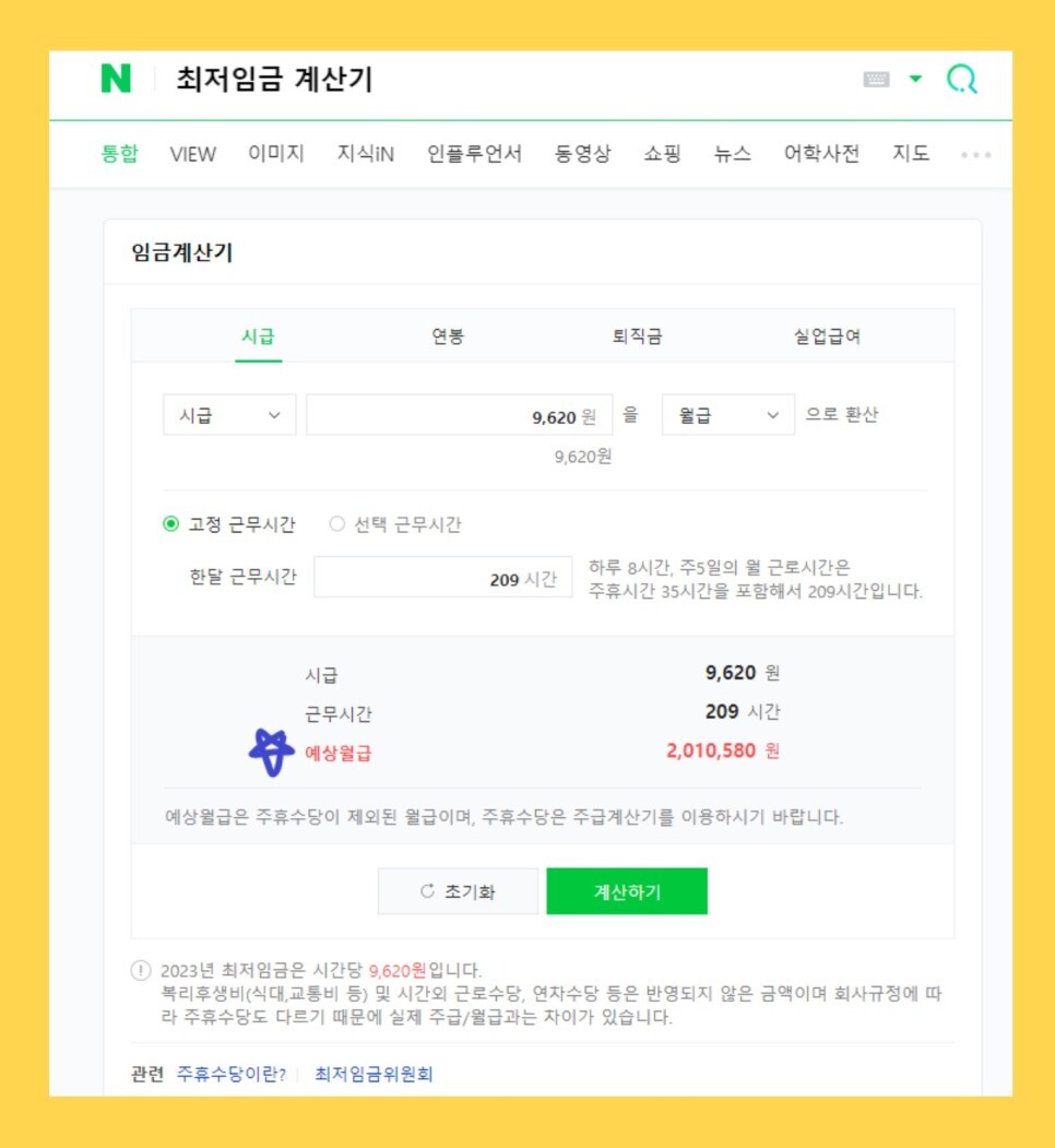 만약 조금 더 상세한 독자님들의 적용 월급이 궁금하시다면 네이버에 최저임금 계산기를 검색하시면 됩니다.