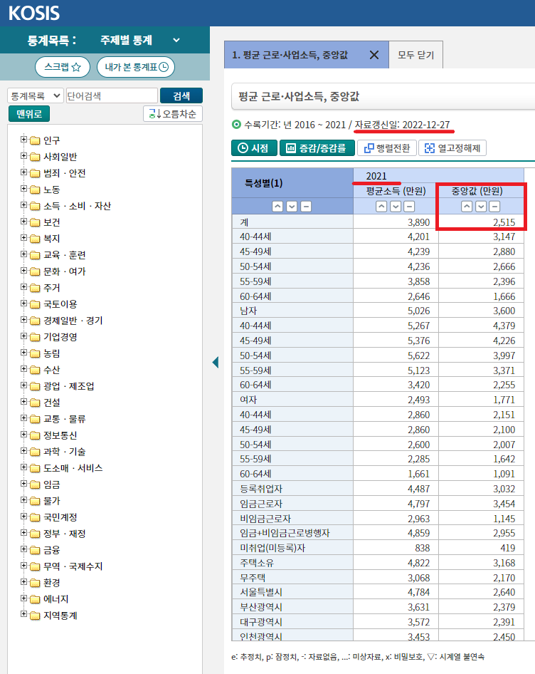 통계청에 들어가면 2021년 평균 소득을 확인할 수 있습니다.