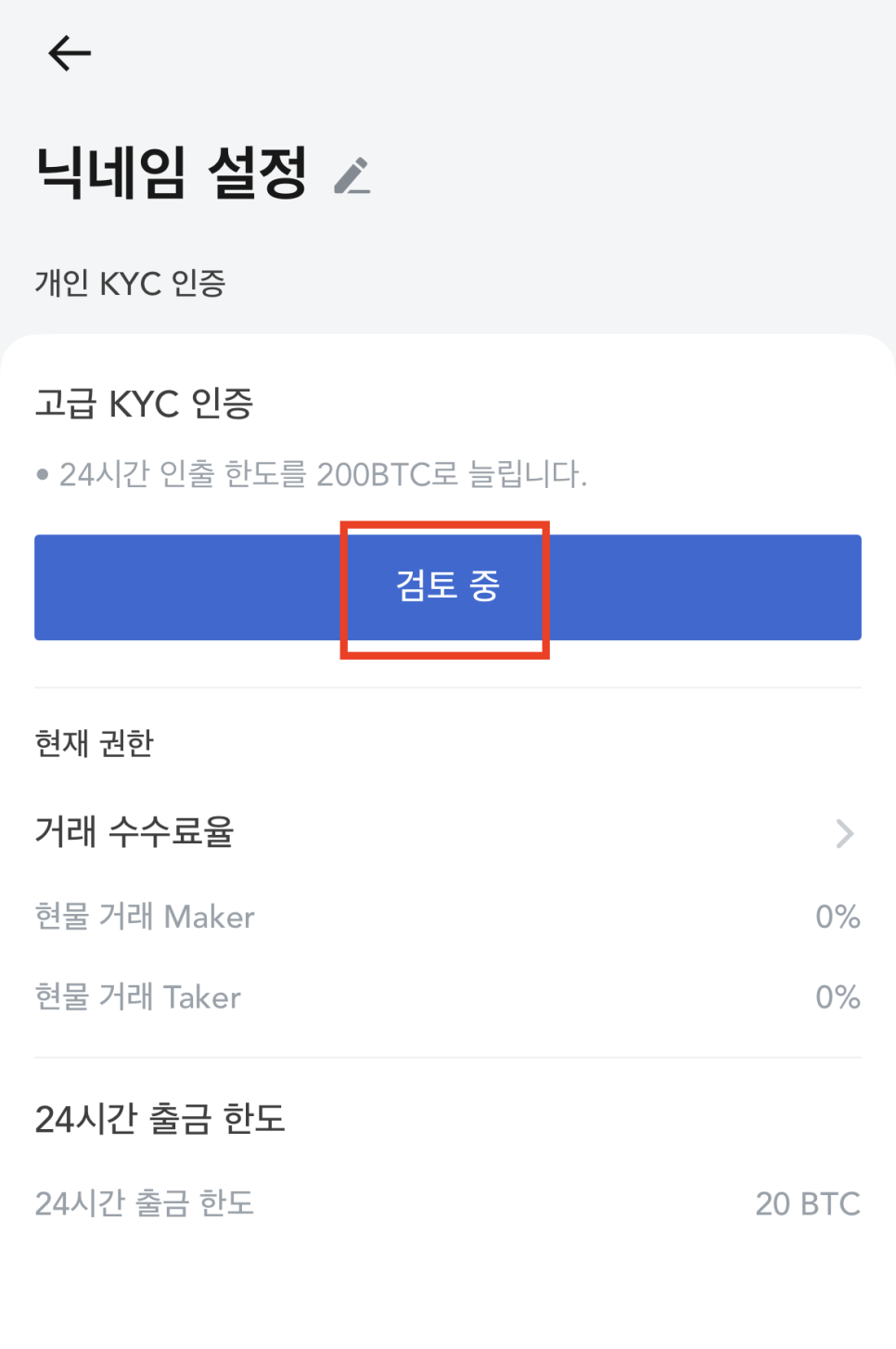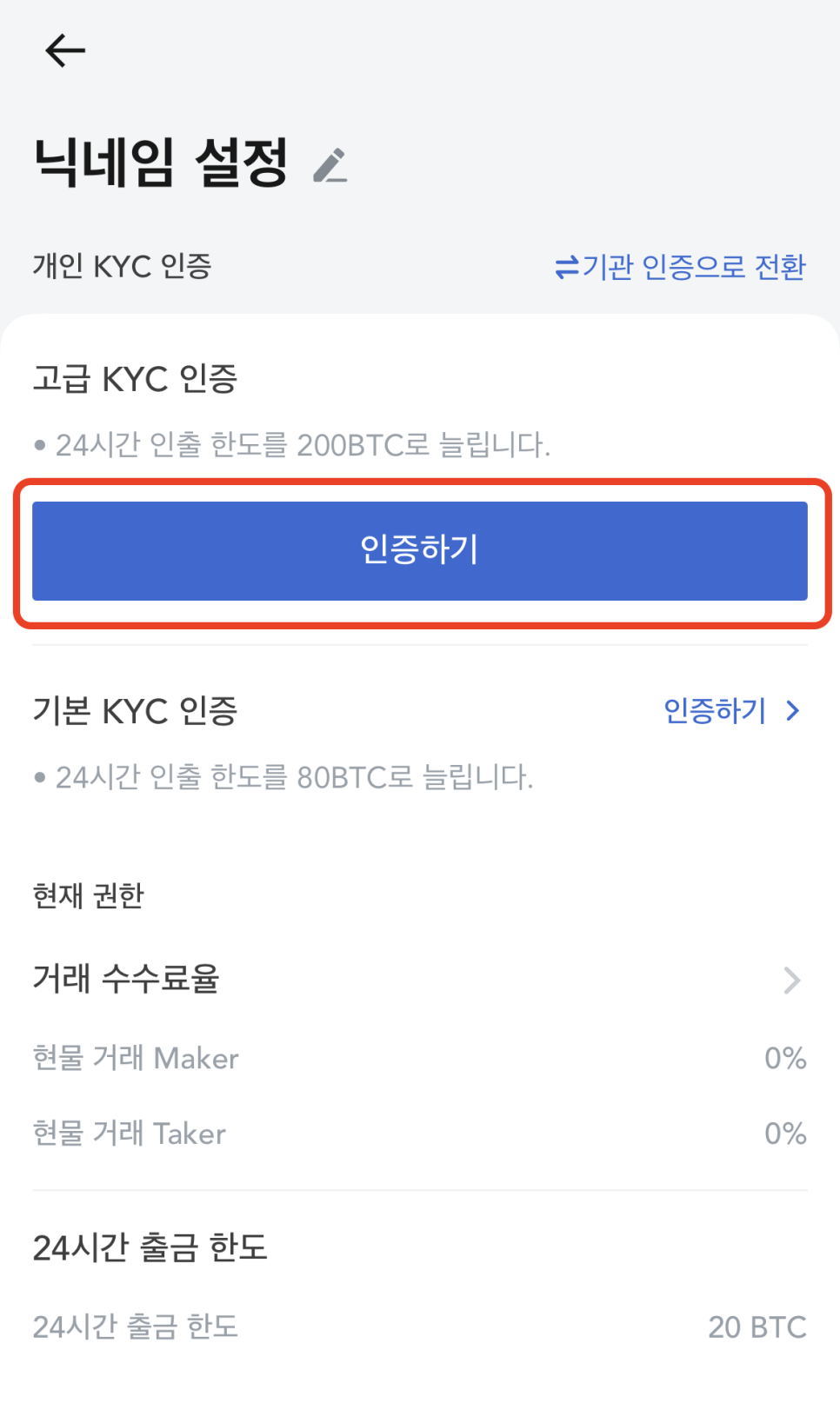 변경된 화면에서 가장 눈에 띄는 ‘고급 KYC인증’ 영역에 있는 [인증하기] 버튼을 다시 선택해주세요!!