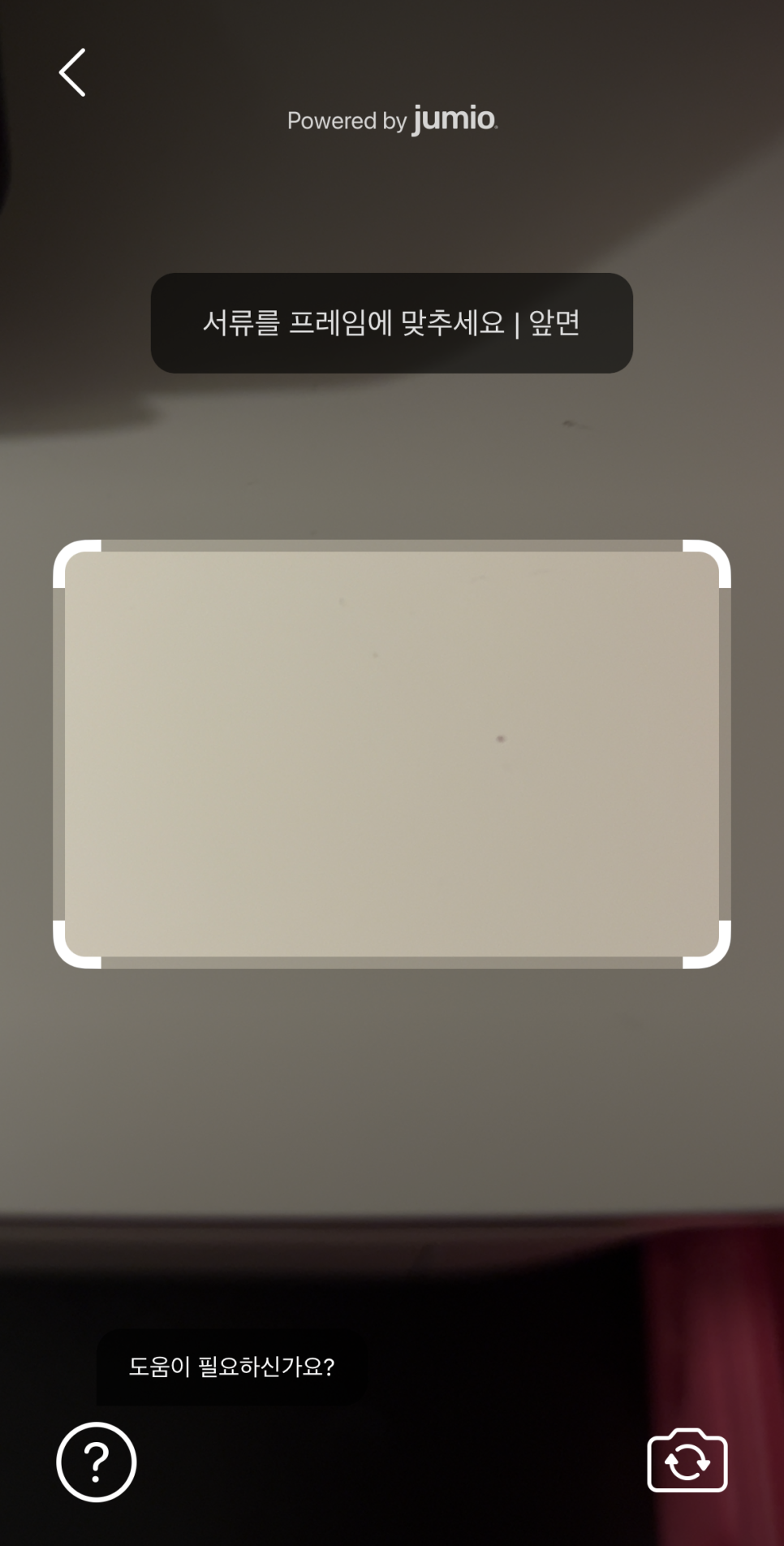 자신이 선택한 신분증의 종류를 선택하신 후 활성화된 카메라 화면에 있는 네모에 맞춰 준비된 신분증을 촬여해주시면 되겠습니다.