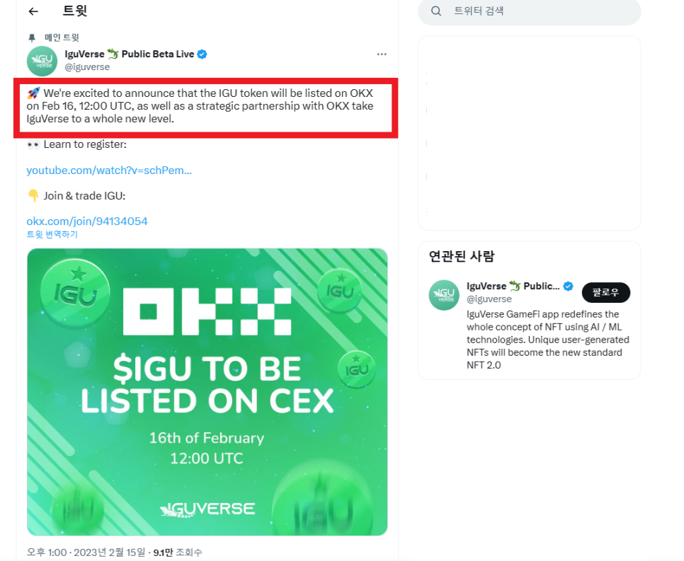 이구버스 트위터를 방문하시면 이렇게 OKX 상장 소식이 나와있습니다.