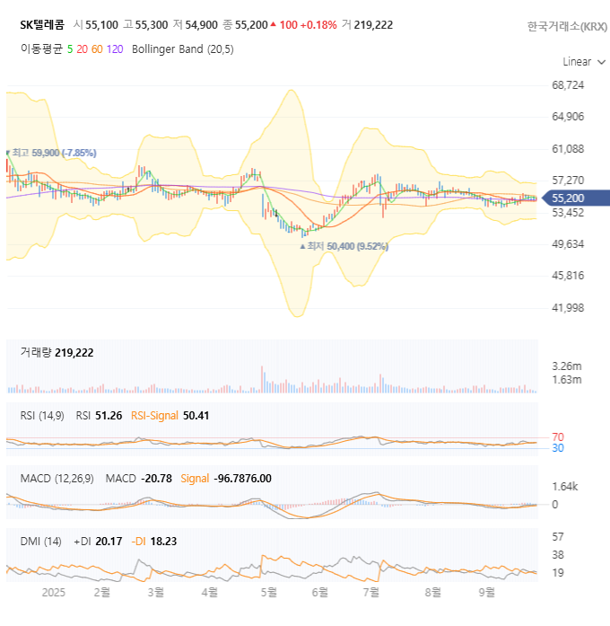 최종 전략 제안: 결론적으로, SK텔레콤은 장기(월봉) 및 중기(주봉) 추세가 상승으로 전환되는 긍정적인 모습을 보이고 있습니다. 다만 단기(일봉)적으로는 박스권에 진입했으므로, 58,000원 박스권 상단 돌파 여부를 확인하는 '돌파 매매'나, 조정 시 54,000원 근처까지의 '눌림목'을 기다리는 보수적 전략이 더 유리해 보입니다.