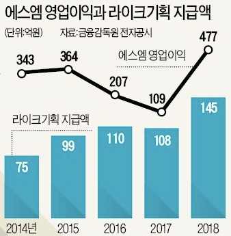 과거 수년간 에스엠 영업이익의 44%에 해당하는 금액이 이 회사로 흘러들어갔습니다.