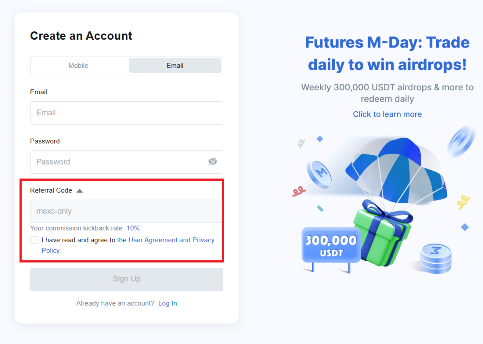 우선 가입하기 전에 수수료 혜택을 알려드립니다. 밑에 알려드릴 링크를 통해서 가입을 하시는 방법이나 가입시 레퍼럴코드 [ mexc-only ]를 입력하실 경우 추가적으로 10% 할인을 받을 수 있는데요. 한 번의 할인이 아닌 매번 수수료에 대한 할인 혜택이라