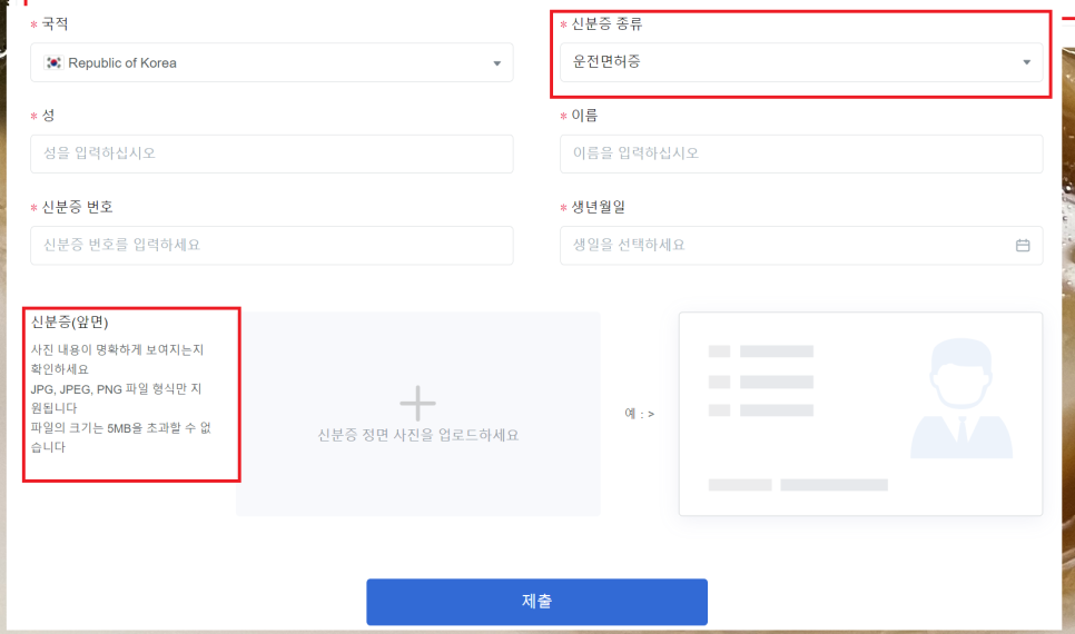 우선 저는 운전면허증으로 진행을 할 예정이고, 여권, 민증 모두 상관 없습니다. 성과 이름의 경우는 제대로 써주세요 (트래블룰), 신분증 번호는 번호 그대로 써주시면 됩니다.
