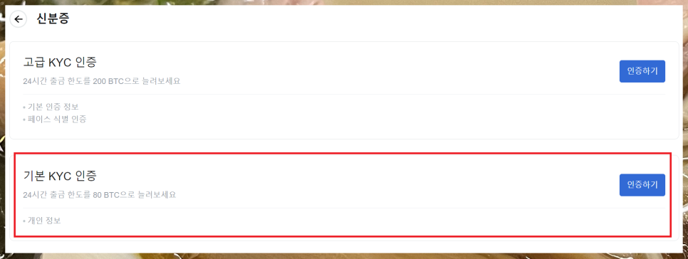 KYC 인증 버튼을 눌러서 들어가면 위와 같이 두개의 방법이 뜨는데요. 사실 고급까지 하셔도 문제는 없습니다만 거래량이 크지 않다면 기본 KYC로도 충분하니 저는 그정도만 진행해볼게요.